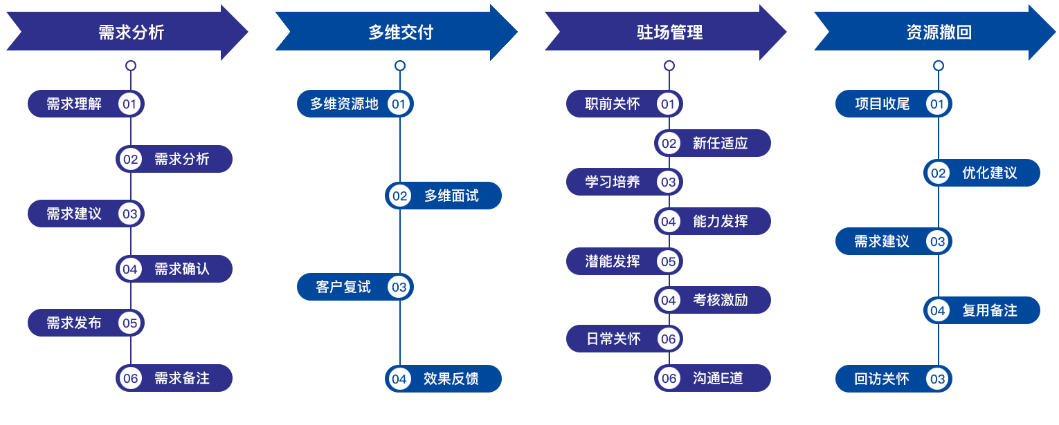根据客户需求,快速调配各类专业人才,满足短期或长期的用工需求。